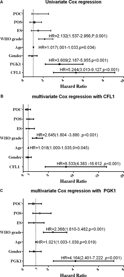 Figure 3: POC: postoperative chemotherapy; POS: preoperative situation; ES: extent of surgery; Univariate/multivariate Cox regression were performed to verify the predicting factors in irradiated patients. (A) univrate Cox regression with all variables; (B) clinical parameters with CFL1 expression; (C) clinical parameters with PGK1 expression. No label variables was not significant (p > 0.05).
