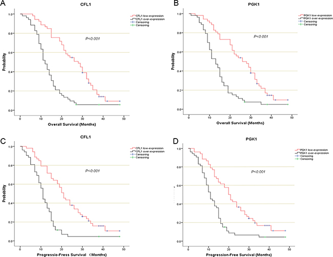 Figure 4: The kaplan-Meier survival analysis described the survival curve of CFL1/PGK1 over-expression and low-expression. (A) CFL1 in OS of entire patients; (B) PGK1 in OS of entire patients; (C) CFL1 in PFS of entire patients; (D) PGK1 in PFS of entire patients. The Log-Rank test were performed to compare the difference of survival rate between each groups.