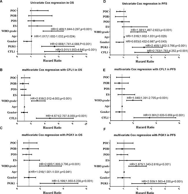 Figure 5: POC: postoperative chemotherapy; POR: postopeartive radiotherapy; POS: preoperative situation; ES: extent of surgery; univariate/multivariate Cox regreesion were carrird out to verify the independent prognosis factors in glioma patients of OS and PFS. (A) univariate in OS; (B) multivariate with CFL1 in OS; (C) multivariate with PGK1 in OS; (D) univariate in PFS; (E) multivariate with CFL1 in PFS; (F) multivariate with PGK1 in PFS. No label variables were not significant (P > 0.05).