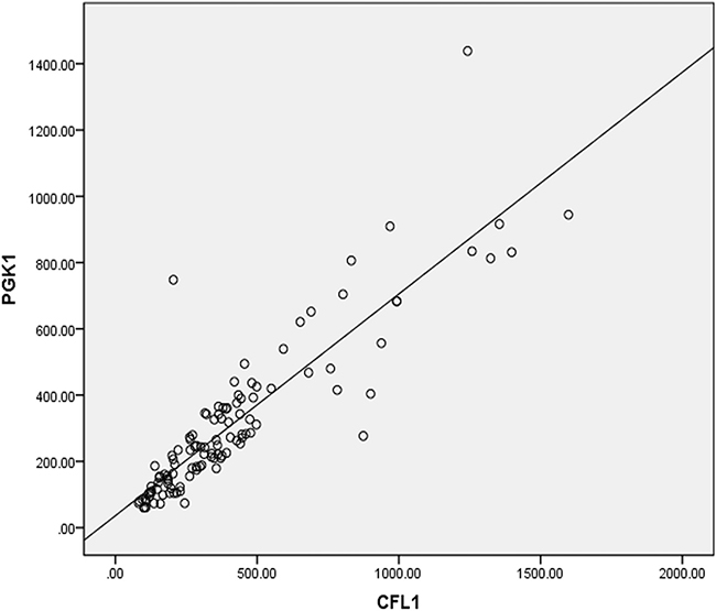 Figure 6: The pearsion coefficient (r) between CFL1 and PGK1 expression was 0.884, p < 0.001.