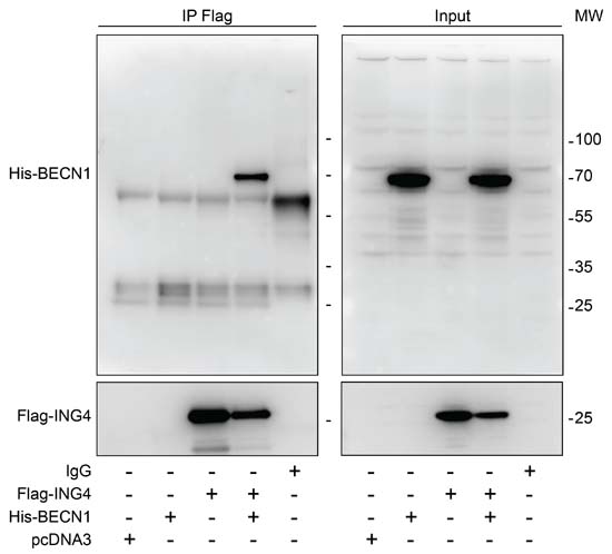 Figure 1: Interaction between ING4 and BECN1. Co-immunoprecipitation of BECN1 with ING4. The indicated constructs, namely Flag-tagged ING4 (Flag-ING4) and His-tagged BECN1 (His-BECN1) were transfected into U2OS cells alone or in combination. The pcDNA3 construct was transfected as internal control of the experiment. Forty-eight hours later, ING4 was immunoprecipitated with a specific antibody for Flag and the precipitate was separated by SDS-PAGE and revealed with an antibody specific for His (upper panels) or Flag (down panels). Results are representative of three independent experiments. Immunoprecipitation (IP), molecular weight (MW).