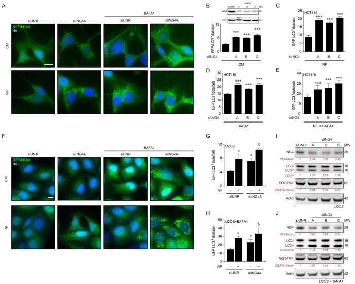 Figure 5: ING4 silencing induces autophagy. A. Representative photomicrographs of ING4 knockdown (siING4A) HCT116 cells stably expressing GFP-LC3 treated with complete (CM) or nutrient free (NF) medium for 6h, in presence or absence of 1μM bafilomycin A1 (BAFA1) for the last 3h. The non-targeting siRNA (siUNR) was used as internal control of the experiments. Hoechst 33342 (Ho, blue) represents nuclear staining. GFP-LC3B puncta (green) correspond to autophagosomes. Scale bars: 10 μm. B.-E. Quantification of GFP-LC3B dots in ING4 knockdown HCT116 cells treated in CM or NF medium for 6h in presence or absence of BAFA1 for the last 3h. To knockdown ING4, 3 different siRNAs were used (siING4A, siING4B and siING4C). Western blot proves the efficiency of siING4s. Data are means ± SD (n = 5). Statistical analysis was performed by Student’s t test in comparison with the control condition, ***p < 0.001. F. Representative photomicrographs of siING4A knockdown U2OS cells stably expressing GFP-LC3, treated with NF medium for 6h or CM, in presence or absence of 1 μM BAFA1 for the last 3h. Hoechst 33342 (Ho, blue) represents nuclear staining. GFP-LC3B puncta (green) correspond to autophagosomes. Scale bars: 10 μm. G., H. Quantification of GFP-LC3B dots in siING4A U2OS cells treated in the same conditions described in (F). Data are means ± SD (n = 5). Statistical analysis was performed by Student’s t test in comparison with the control condition (siUNR, *p < 0.05 ; siING4A, $ p < 0.05). I., J. Western blot detection of ING4 levels, LC3B conversion and SQSTM1 degradation in U2OS knockdown cells with 3 different ING4 siRNAs in absence (I) or presence (J) of 1 μM BAFA1 for 3h. Actin was used as a loading control. Densitometry was employed to quantify the efficiency of the ING4 silencing and abundance of lipidated LC3 (LC3-II/LC3 I ratio or LC3II/actin ratio when BAFA1 is added) and SQSTM1 (normalized to actin levels). Results are representative of three independent experiments. Molecular weight (MW).
