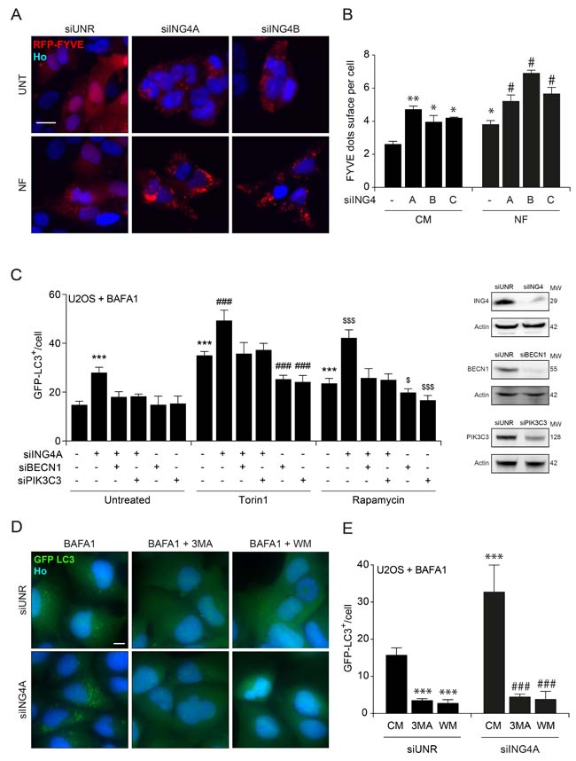Figure 6: ING4 silencing leads to autophagy due to an increase of the PIK3C3 activity. A. Representative photomicrographs of ING4 knockdown (siING4A, siING4B) U2OS cells stably expressing RFP-tagged short peptide (FYVE) treated with complete (CM) or nutrient free (NF) medium for 6h. The non-targeting siRNA (siUNR) was used as internal control of the experiments. Hoechst 33342 (Ho, blue) represents nuclear staining. RFP-tagged short peptide (red) corresponds to activation of PIK3C3. Scale bars: 10 μm. B. Quantification of FYVE puncta upon ING4 silencing (siING4A, siING4B, siING4C), in cells treated with CM or NF for 6h. Data are means ± SD (n = 5). Statistical analysis was performed by Student’s t test in comparison with the control condition (**p < 0.01, *p < 0.05) or in comparison with the NF condition (# p < 0.05). C. Quantification of the number of GFP-LC3B dots in U2OS cells knockdown for ING4 (siING4A), Beclin 1 (siBECN1) or PIK3C3 (siPIK3C3) alone or in combination as indicated. Western blot proves the efficiency of ING4, BECN1 and PIK3C3 siRNAs. After the silencing cells were treated with complete medium (Untreated), Torin1 (300nM) or Rapamycin (1 μM) for 6h in presence of BAFA1 (1 μM) for the last 3h. Data are means ± SD (n = 5). Statistical analysis was performed by Student’s t test in comparison with the control condition (***p < 0.001) or in comparison with the Torin1 (### p < 0.001) or Rapamycin ($ p < 0.05, $$$ p < 0.001) conditions. D. Representative photomicrographs of ING4 knockdown (siING4A) U2OS cells stably expressing GFP-LC3B treated with complete medium (CM) or 3 methyladenine (3MA; 10mM) or wortmannin (WM; 10 μM) for 6h in presence of BAFA1 (1 μM) for the last 3h. (E) Quantification of the number of GFP-LC3B dots in ING4 knockdown (siING4A) U2OS cells, treated with chemical inhibitors of PIK3C3: 3MA or WM for 6h in presence of BAFA1 (1 μM) for the last 3h. Data are means ± SD (n = 5). Statistical analysis was performed by Student’s t test in comparison with the CM of siUNR condition (***p < 0.001) or in comparison with the CM of siING4A condition (### p < 0.001).