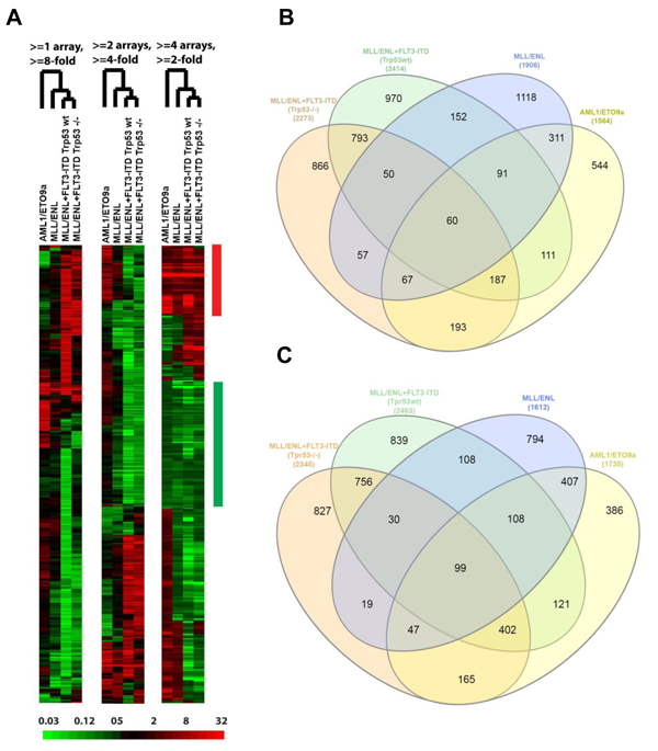 Figure 1: BM-MSC transcriptome regulation by AML. A., Three “subtracted” heat maps showing the relative change in expression, according to AML genotype, for genes selected by different criteria. In each heat map, the fold change relative to control BM-MSC is represented according to the color bar at the bottom. Each heat map has been hierarchically clustered for similarity between genes (rows) in the pattern of fold change across compared samples (columns), and for similarity between compared samples (labeled by genotype) in the pattern of gene expression changes. Similarity of genotype effects is indicated by the branched dendrogram, with the two MLL/ENL+FLT3-ITD genotypes (differing by Trp53 status) giving the most similar changes. Criteria for gene selection at the top indicate the number (1-4) of comparisons (“arrays”) and fold-change magnitude (up or down) required. The bars at the right indicate groups of “common” genes in which the fold-change requirement has been met in the same direction, up (red) or down (green), for all 4 comparisons at the > = 2-fold change level. B.-C., Overlap between AML genotypes of genes with altered expression in BM-MSC. Gene probes with a fold-change from control of at least 2 in at least one AML genotype were identified, then numbers of genes were plotted using Venn diagrams according to overlap between genotypes for genes whose expression went up (B) or down (C) in AML-exposed BM-MSCs.