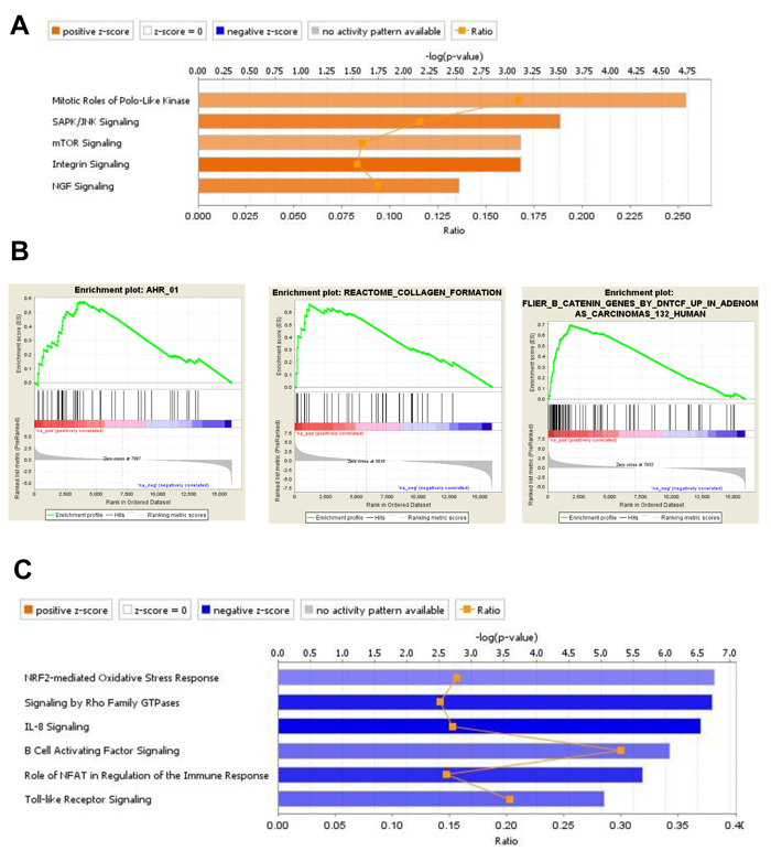 For BM-MSC exposed to MLL/ENL+FLT3-ITD Trp53 wt, canonical pathway IPA of the 970 uniquely up-regulated DEGs indicated a positive role for Polo-like kinase in mitosis, activation of signaling mediated by SAPK/JNK, mTOR, integrins and NGF (Figure 6A). Interestingly, NGF (nerve growth factor) is a secreted factor that, in addition to controlling cell survival, growth, and differentiation, can regulate inflammatory responses [26] by interfering with Toll-like receptor (TLR) signaling. None of these pathways were significant when up-regulated genes from BM-MSC from the MLL/ENL+FLT3-ITD Trp53-/- condition were analyzed. IPA for down-regulated genes showed a significant negative z-score for IL-8 and TLR -mediated signaling. Negative scores were shown as well as for the role of NFAT in the regulation of immune response and signaling by Rho family of GTPases, indicating that these signaling pathways were uniquely inhibited in BM-MSC challenged with the p53 wt-expressing leukemia sample (Figure 6C). There was a relatively small number of gene sets significantly enriched in GSEA for Trp53 wt, including ones associated with collagen formation (uniquely enriched), activation of aryl hydrocarbon receptor (AHR) signaling (also observed in BM-MSC exposed to AML1/ETO9a), and activation of β-catenin (Figure 6B). Interestingly, IPA results were confirmed in that there was a negative enrichment for gene sets associated with positive regulation of IL-6 and IL-8 production, indicating a decrease in the production of these cytokines and a reduced inflammatory response.