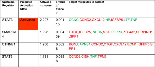 Transcriptional regulators identified by IPA as candidates for modulating the gene expression changes observed in our experimental dataset. The analysis predicts which upstream regulators are activated or inhibited to explain the up-regulated (red) and down-regulated (green) genes observed in the dataset. The overlap p-value measures whether there is a statistically significant overlap between the dataset genes and the genes that are regulated by a transcriptional regulator. It is calculated using Fisher’s Exact Test, and significance is generally attributed to p-values < 0.01. The calculated z-score reflects the overall predicted activation state of the regulator where z-scores greater than 2 (activation) or smaller than-2 (inhibition) can be considered significant.
