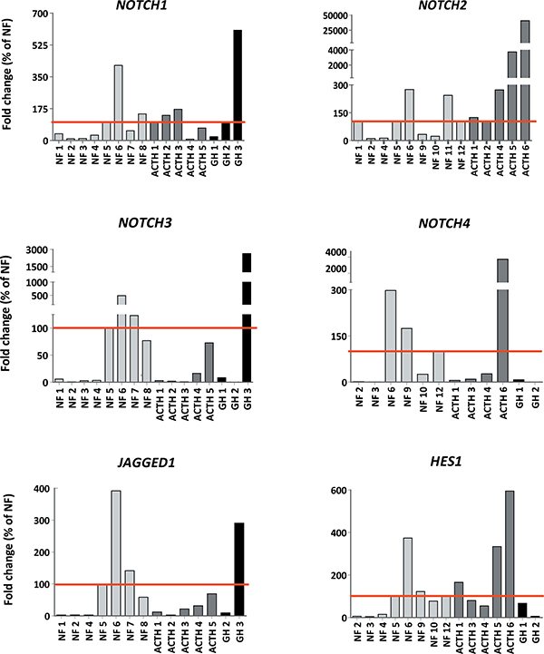 Figure 1: Notch system components are expressed in human pituitary adenomas. mRNA expression of NOTCH1-4 receptors, JAGGED1 ligand and HES1 target gene were determined by qRT-PCR. Gene levels normalized to the housekeeping gene Gadph are shown as percentage of change of NF average (which was considered 100%) (NF = non functioning adenoma; ACTH = corticotropinoma; GH = somatotropinoma).