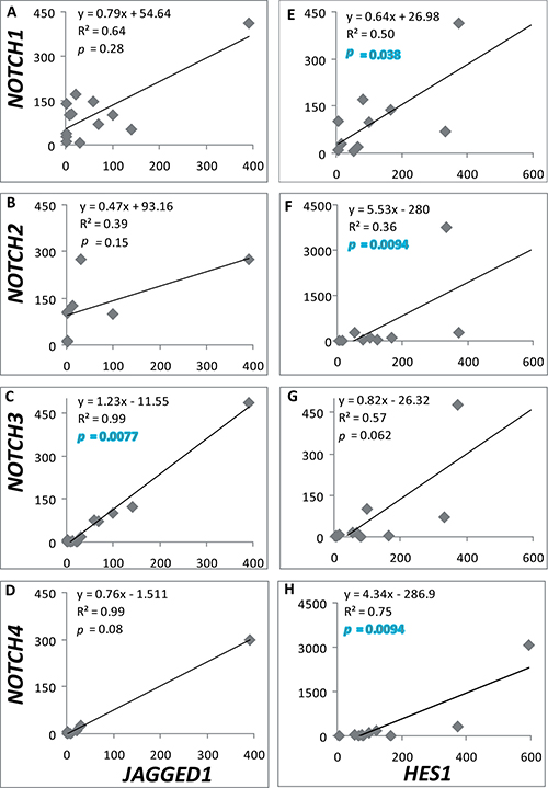 Figure 2: NOTCH-JAGGED1 and NOTCH-HES1 correlations. Relation between mRNA levels of NOTCH1-4 and JAGGED1 (n = 13, 8, 13, 6 (A–D)) or HES1 (n = 11, 10, 11, 12 (E–H)) was determined in all adenomas tested. The equation of linear regression, R2 coefficient of determination and coefficient of Spearman are shown in each graph. p ≤ 0.05 denotes a significant correlation.