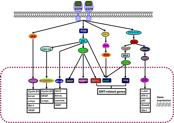 Figure 1: EGFR-Akt-NF-κB pathway. The interaction of epidermal growth factor receptor (EGFR) and its ligand induces the dimerization, activation of intrinsic kinase activity and subsequent autophosphorylation of EGFR Tyr 1092, Tyr 1172, Tyr 1197, Tyr 1110, Tyr 1016. JAK/stat3, PI3K/Akt/mTOR and src/FAK/ROS, SOS/Grb2/Ras pathways are triggered to result in the cytonuclear translocation of Stat3, β-catenin, NF-κB, SK61, 4EBP1, HIF1α, snail, slug and JNK for the transcriptional regulation of downstream genes.