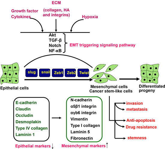 Figure 3: EMT triggering and signal transduction. EMT is triggered by the interplay of extracellular signals (collagen, hyaluronic acid and integrin), growth factors and cytokines (TGF-β, VEGF, EGF and HGF), and hypoxia. The receptor- mediated signal pathways involve Akt, smad, Notch and NF-κB, finally to up-regulate a set of transcription factors including snai1, slug, Zeb1, Zeb2, and Twist, which regulate the expression of epithelial and mesenchymal markers at a transcriptional level. Consequently, there appear the down-regulation of epithelial markers (E-cadherin, claudin, occludin, desmoplakin, type IV collagen, and laminin 1) and up-regulation of mesenchymal markers (N-cadherin, intregrin, vimentin, type I collagen, laminin 5, and fibronectin). The mesenchylmal stem -like cells displayed the aggressive phenotypes, including invasion, metastasis, anti-apoptosis, drug resistance and stemness. HA, hyaluronic acid; ECM, extracellular matrix.