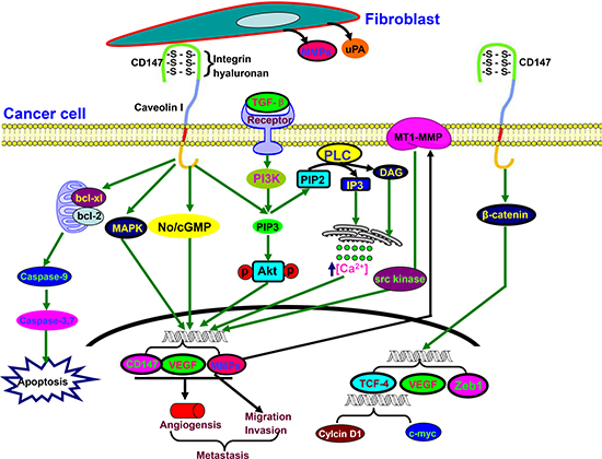 Figure 4: The biological functions of CD147. Activated CD147 might increase tumor invasion by inducing the release of MMPs and uPA in the surrounding stromal cells. It also stimulates tumor angiogenesis by elevating VEGF and MMP expression in neighboring fibroblasts and epithelial cells via microvesicle shedding. Hyaluronan, caveolin, or integrin α3β1 interacts with CD147 in cancer cells and enhances the effect of CD147 on adhesion, invasion and MMPs secretion. Up-regulated CD147 expression is induced by TGF-β coupled with epithelial-mesenchymal transition, and targets PIP3, No/cGMP, and MAPK to induce EMT for cancer invasion and metastasis. Additionally, CD147 suppresses the mitochondria-dependent apoptosis via Bcl-2 and Bcl-xL. CD147 expression is controlled by the cell survival PI3K/Akt/GSK3β signaling pathway, and is directly regulated by the transcription factor Slug. CD147 overexpression promotes the nuclear translocation of β-catenin, which up-regulates the transcriptional level of TCF-4, VEGF and Zeb1.