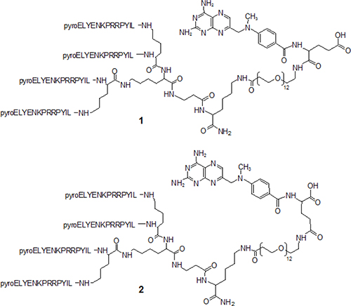 Peptide conjugated with methotrexate was synthesized using Fmoc-Lys(Dde)-OH as the first amino acid on Tentagel resin and Fmoc-βAla-OH as the second amino acid. Two coupling steps with Fmoc-Lys(Fmoc)-OH were used to build the core. Pyro-Glu-O-pentachlorophenylester was the N-terminal acid. Once the sequence was completed, the Dde protective group was removed using 2% hydrazine in DMF (v/v) on resin and the free amino group was coupled with Fmoc–PEG12–OH. The Fmoc group was then removed to enable coupling with Fmoc-L-Glu(tBu)-OH in the case of 1 and with Fmoc-L-Glu-OtBu in the case of 2. Finally Fmoc was removed and 4-[N-(2,4-diamino-6-pteridinylmethyl)-N-methylamino]benzoic acid was conjugated using HBTU and DIPEA as coupling reagents. Once solid-phase synthesis was completed, the peptides were cleaved from the resin, deprotected and lyophilized.