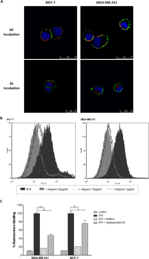 Figure 2: NT4 binding to MCF-7 and MDA-MB 231. (A) Binding (30’ incubation) and internalization (4 h incubation) of NT4 (red) in MCF-7 (left panel) and MDA-MB 231 cells (right panel) analyzed by confocal microscopy. Nuclei were stained with DAPI (blue) and plasma membrane was stained with wheat germ agglutinin (green). (B and C) Flow cytometry analysis of NT4 binding to MCF-7 and MDA-MB 231 cells and its inhibition by different concentrations of heparin (B) or by heparin binding proteins Apolipoprotein E4 and Midkine (C). Florescence of cells without NT4 is taken as control. Data presented as mean ± SD. *p < 0.05, **p < 0.01, ***p < 0.001 calculated using two-tailed Student t-test using GraphPad Prism 5.03 software.