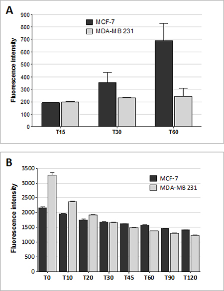 To analyze active cell drug export mechanisms, MCF-7 and MDA-MB 231 cells were exposed to 1 μM Rho 123 for 10 minutes, then washed twice with PBS-5 mM EDTA-5% BSA to remove excess of Rho 123, and fluorescence was monitored immediately (T0) and after 10, 20, 30, 45, 60, 90 and 120 minutes. Each step was followed by three washes in PBS-5 mM EDTA-0.5% BSA. P values were calculated using two-tailed Student’s t-test (99% confidence interval) using Graph Pad Prism 5.03 software. P values were reported in figure legend.