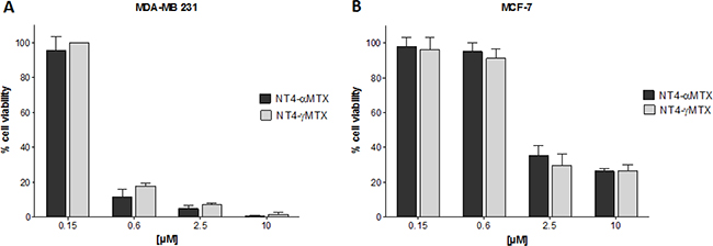 Figure 5: Cytotoxicity of NT4-α-MTX (dark grey) and NT4-γ-MTX (light grey) in MTX-resistant MDA-MB 231 (A) and MTX-sensitive MCF-7 (B) human breast cancer cell lines. Data presented as mean ± SD.