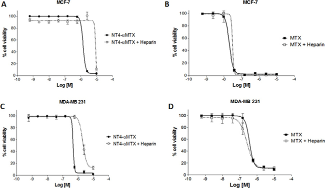 Figure 7: Cytotoxicity of NT4-α-MTX in human breast cancer cell lines, with and without heparin; NT4-α-MTX and free-MTX in MCF-7 (A and B) and MDA-MB 231 (C and D).