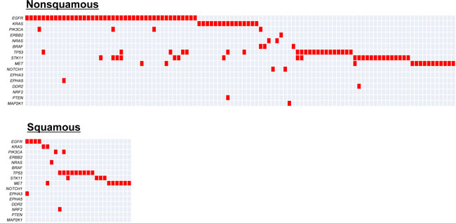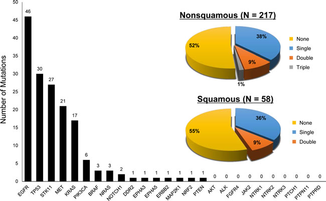Of the 295 specimens referred for somatic mutation analysis, 275 (93.2%) provided mutational profiles with a >90% success rate for genotyping (Figure 1). Somatic mutations in at least one gene were identified in 105 (48%) of the 217 patients with non–squamous cell carcinoma (non-SCC) and in 26 (45%) of the 58 patients with SCC. Twenty-five (9.1%) specimens (20 non-SCC, 5 SCC) were positive for mutations in two genes, and three non-SCC tumors each had mutations in three genes (Figure 2A). Overall, we identified EGFR mutations in 46 patients (17%), TP53 mutations in 30 (11%), STK11 mutations in 27 (9.8%), MET mutations in 21 (7.6%), KRAS mutations in 17 (6.2%), PIK3CA mutations in 6 (2.2%), BRAF and NRAS mutations in 3 each (1.1%), NOTCH1 mutations in 2 (0.7%), and DDR2, EPHA3, EPHA5, ERBB2, MAP2K1, NRF2, and PTEN mutations in 1 each (0.4%) (Figure 2B). Among the 46 patients with EGFR mutations, 15 individuals (33%) had a deletion in exon 19 and 24 individuals (52%) had a point mutation (L858R or L861Q) in exon 21, whereas three patients had point mutations in exon 18, two had point mutations in exon 19, and two had mutations in exon 20 (Supplementary Table S2). Mutation profiles for patients harboring at least one mutation are shown in Figure 2C. EGFR and KRAS mutations were mutually exclusive. Of the 46 patients with EGFR mutations, three also harbored PIK3CA mutations. Four patients with KRAS mutations also had an additional mutation in STK11, in TP53 and PTEN, in TP53, or in MET.