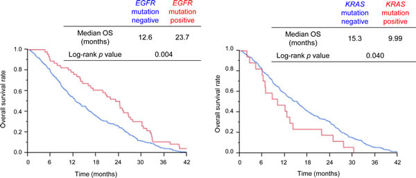 The median OS of EGFR mutation–positive patients was significantly longer than that of patients without EGFR mutations (23.7 vs. 12.6 months, P = 0.004) (Figure 2D). Conversely, patients with KRAS mutations had a significantly shorter median OS than did those with wild-type KRAS (9.99 vs. 15.3 months, P = 0.040) (Figure 2D).