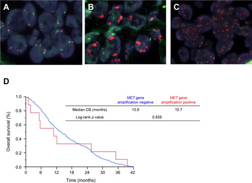 Figure 4: FISH analysis of de novo MET amplification in advanced NSCLC and survival analysis according to MET amplification status. A–C, Representative FISH images for specimens negative (A) or positive (B and C) for MET amplification. Green and red signals correspond to CEN7p and the MET locus, respectively. D, OS according to de novo MET amplification status in advanced NSCLC patients.