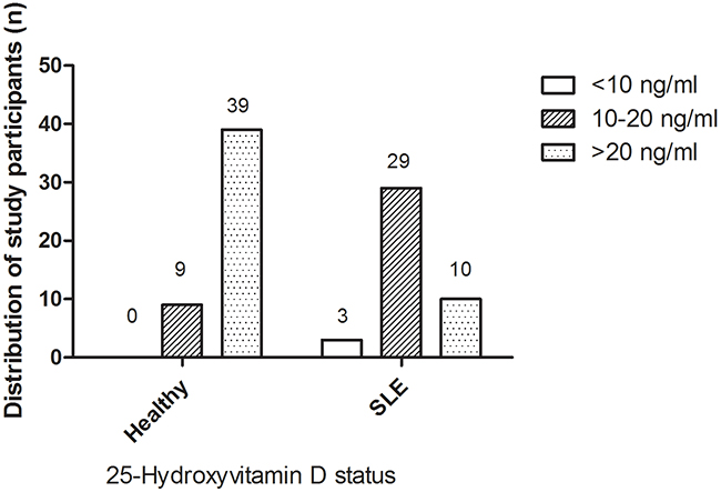 Figure 1: Distribution of study participants with respect to vitamin D status in SLE and healthy groups.