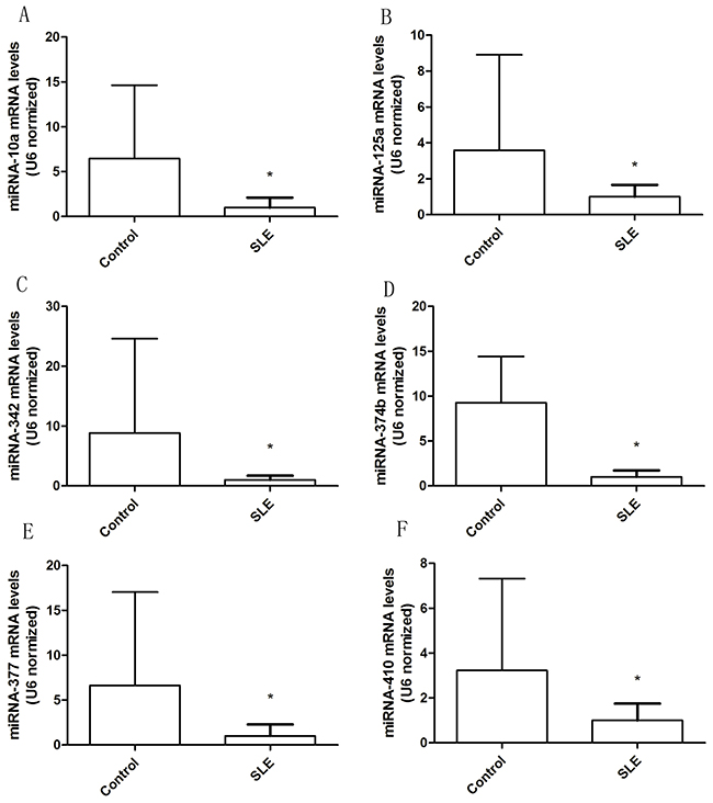It has recently become evident that miRNA plays an important role in immune homeostasis and aberrant expression of certain miRNAs, which is thought to contribute to the initiation and progression of autoimmunity [26, 27]. Altered miRNA expression has been reported in the pathology of SLE in several studies [28, 29]. Despite the abundance of studies showing the involvement of miRNAs in SLE, the precise role of dysregulated miRNAs levels in SLE remains to be determined. miRNAs are a group of newly discovered non-coding RNAs of 22 nucleotides that are widely present in tissue, plasma, and other body fluids. They can cause the degradation of mRNA or suppress gene translation by interacting with the 3’UTR of targeted mRNA. Recent studies have shown that alteration of the expression of miRNAs is closely associated with autoimmune disease by considering that aberrant expression of miRNA 21 and miRNA 126 is closely associated with initiation and development of dysfunction of T cells [23, 30]. Furthermore, through the function predication and analysis with TargetScan database, we found miRNA 10a, miRNA125a, miRNA 342, miRNA 374b, miRNA 377, and miRNA 410 might be associated with vitamin D receptor and vitamin D signaling pathway. However, to date, the expression of miRNA 10a, miRNA125a, miRNA 342, miRNA 374b, miRNA 377, and miRNA 410 and their function in autoimmune diseases, such as SLE, and the association with vitamin D status, have rarely been reported.