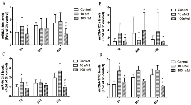 To investigate the impact of 1α,25(OH)2D3 on the expression of miRNAs, T cells from SLE patients were treated with 10nM, and 100nM for 3h, 24h, and 48h and the expression of miRNA-342, miRNA-10a, miRNA-374b, and miRNA-125a were examined by qRT-PCR assays [25]. Within T cells, 1α,25(OH)2D3 markedly regulated miRNAs expression as compared to ETOH control, and the regulation showed dynamic changes at different time (Figure 5).