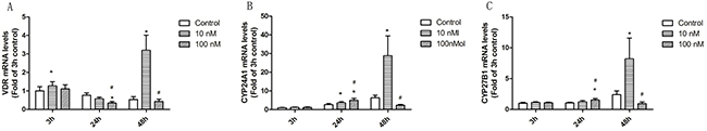 Figure 6: The effect of 1α,25(OH)2D3 on mRNA expression in T cells from SLE patients. (A) The effect of 1α,25(OH)2D3 on VDR mRNA expression in T cells from SLE patients. (B) The effect of 1α,25(OH)2D3 on CYP24A1 mRNA expression in T cells from SLE patients. (C) The effect of 1α,25(OH)2D3 on CYP27B1 mRNA expression in T cells from SLE patients. T cells were plated as described in methods and treated with 10 nM and 100 nM1α,25(OH)2D3 for 3h, 24h and 48h. The error bars represents the standard deviation (SD). n=16 for each experiment. * p<0.05 vs con; # p<0.05 100 nM vs 10 nM treatment.