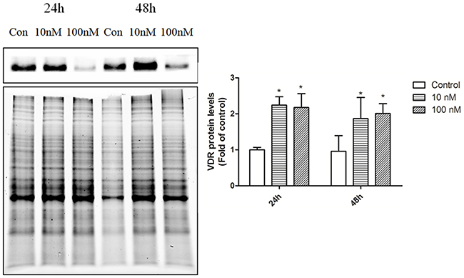 Figure 7: VDR protein expression in T cells from SLE patients. T cells were treated with control ETOH or 10 nM, 100 nM 1α,25(OH)2D3for 24h and 48h. VDR protein expression was examined by immunoblot analysis. The error bars represents the standard deviation (SD). n=16 for each experiment. * p<0.05 vs con; # p<0.05 100 nM vs 10 nM treatment.