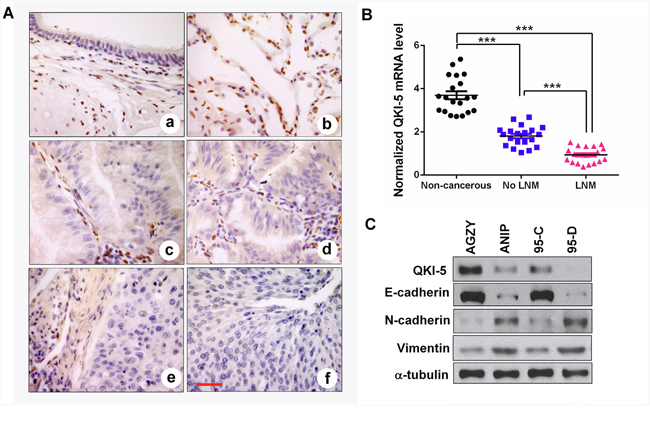 Figure 1: QKI-5 downexpression in human LC tissues and cell lines with metastasis is accompanied by EMT. (A) IHC representative images of QKI-5 expression in bronchial epithelial (a), alveolar epithelium (b), lung adenocarcinoma (c, d) and lung squamous cancer (e, f). Scale bar, 50 μm. (B) Comparisons among groups of QKI-5 mRNA level in 20 non-cancerous lung tissues, 20 LC tissues without (No LNM) and 20 LC tissues with (LNM) lymph node metastasis. The QKI-5 mRNA level was analyzed by qRT-PCR and normalized against GAPDH. The ratio of QKI-5/GAPDH in LNM group was arbitrarily set to 1.0. The data are presented as the mean ± SD. ***P<0.001. (C) Western blotting analyses of QKI-5 and EMT markers (E-cadherin, N-cadherin, Vimentin) in two pairs of differential metastatic LC cell lines (AGZY vs ANIP, 95C vs 95D). α-tubulin was used as the loading control.