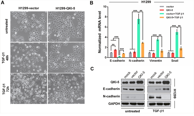 Figure 3: QKI-5 overexpression restrains the TGF-β1-induced EMT of LC cells. (A) Representative images of H1299-vector (control) and H1299-QKI-5 (QKI-5-overexpressing) cells untreated or incubated with TGF-β1 (5 ng/mL) for 48 or 72 h (×200). (B) mRNA levels of E-cadherin, N-cadherin, Vimentin and Snail in the indicated cells incubated with TGF-β1 or untreated in DMEM for 72 h as in A. The mRNAs were detected by qRT-PCR and normalized against GAPDH. The ratios of the above mRNAs to GAPDH mRNA in control cells (vector) were arbitrarily set to 1.0. The data are presented as the mean ± SD. **P<0.01, ***P<0.001. (C) Protein levels of QKI-5, E-cadherin and N-cadherin measured by Western blotting in the indicated H1299 cells.