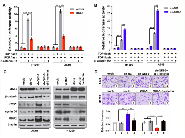 Figure 4: QKI-5 suppresses LC cell invasion by blocking β-catenin signaling pathway. (A and B) Relative luciferase activities in subcell lines of control (H1299-vector, A549-vector) and QKI-5 expression (H1299-QKI-5, A549-QKI-5) (A), or in subcell lines of control (H1299-sh-NC, A549-sh-NC) and QKI-5 knockdown (H1299-sh-QKI-5, A549-sh- QKI-5) (B), co-transfected with TOP or FOP flash plus β-catenin-expressing plasmid (β-catenin-HA) as β-catenin/TCF/LEF pathway activator, and β-galactosidase-expressing plasmid as transfection efficiency control. TOP flash=the reporter plasmid containing three wild type binding sites of β-catenin-TCF/LEF complex in its luciferase promoter, FOP flash=the negative control plasmid containing the mutated binding sites of β-catenin-TCF/LEF complex. The data were normalized according to the ratio of firefly luciferase activity to the β-galactosidase value. (C) Protein levels of QKI-5, β-catenin, c-myc, cyclin D1 and MMP2 detected by Western blotting in the indicated cells. (D) Representative images (upper) and quantitative data (bottom) of invasion of the indicated A549 and H1299 cells assessed by transwell assay. All the experiments were performed at least in triplicate and the data in A, B and D are presented as the mean ± SD. **P<0.01, ***P<0.001.