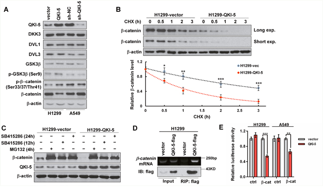 Figure 5: The mechanisms by which QKI-5 decreases β-catenin in LC cells. (A) Western blotting analyses of QKI-5, DKK3, DVL1, DVL3, GSK3β, p-GSK3β (Ser9), p-β-catenin (Ser33/37/Thr41) and β-catenin in the indicated cells. (B) Comparison of β-catenin degradation between control (H1299-vector) and QKI-5-overexpressing (H1299-QKI-5) cells in which β-catenin synthesis was interdicted with CHX (100 μg/mL). The β-catenin levels at the indicated time points were detected by Western blotting (upper) and normalized against 0 h (bottom). (C) Comparisons of β-catenin and QKI-5 levels between H1299-vector and H1299-QKI-5 cells in which β-catenin degradation was blocked with proteasome inhibitor MG132 or GSK3β inhibitor SB415286 (25μM). (D) Directly binding between QKI-5-flag and endogenous β-catenin mRNA verified by RIP. H1299 cells were transfected as indicated. 36 h later, the cell lysates were prepared and QKI-5-flag was immunoprecipitated using anti-flag-beads. The β-catenin mRNA in immunoprecipitation was detected by RT-PCR. (E) Dual luciferase reporter assays in H1299 and A549 cells cotransfected with ctrl or β-cat reporter and vector or QKI-5 expressing plasmid; ctrl=the empty reporter plasmid, β-cat=the reporter plasmid of wild-type β-catenin 3′-UTR. The data were normalized according to the ratio of firefly luciferase activity to renilla luciferase activity. All experiments were performed at least in triplicate and the data in B and E are presented as the mean ± SD. *P<0.05, **P<0.01, ***P<0.001.