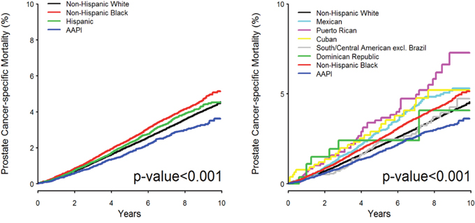 In summary, our data indicate that ethnic heterogeneity amongst Hispanic/Latino populations in the United States significantly contributes to PCSM, which should be considered in guidelines for clinical practice. Two distinct subgroups had PCSM rates that were higher than all other racial and/or ethnic groups when compared to NHW men. Compared to NHB men, PCSM was significantly worse in Puerto Rican men and showed no difference in Mexican men. As appreciated in the NHB population, this type of information drives screening policy recommendations and affects management recommendations, including active surveillance. Further investigation into potentially contributing biological, socioeconomic, and/or sociocultural factors unique to certain Hispanic/Latino subgroups is warranted.