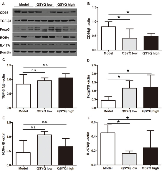 Figure 3: Effect of QSYQ on regulatory T cells and T helper 17 cells in atherosclerotic aorta of ApoE-/- mice. (A) The expression of CD36 (macrophage-related), TGF-β1/Foxp3 (regulatory T cells-related) and RORγ/IL-17A (T helper 17 cells-related) in atherosclerotic aorta of ApoE-/- mice were detected by western blotting. (B, C, D, E and F) The quantitative comparison of CD36, TGF-β1, Foxp3, RORγ and IL-17A between drug treatment groups and model group (n=3). Data were showed as mean ± standard deviation and compared by one-way analysis of variance and following with Fisher’s Least Significant Difference test for individual comparisons. n.s.p > 0.05; ★p < 0.05.