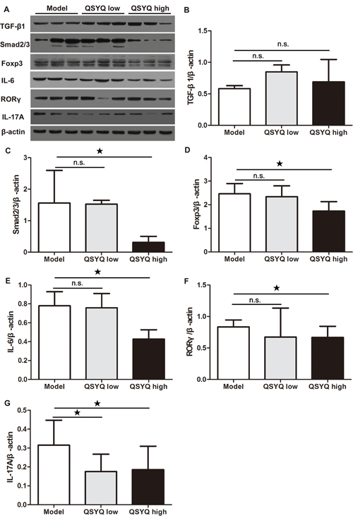 Figure 4: Effect of QSYQ on regulatory T cells and T helper 17 cells in spleen of ApoE-/- mice. (A) The expression of TGF-β1/Smad2/3/Foxp3 (regulatory T cells-related) and IL-6/RORγ/IL-17A (T helper 17 cells-related) in spleen of ApoE-/- mice were detected by western blotting. (B, C, D, E, F and G) The quantitative comparison of TGF-β1, Smad2/3, Foxp3, IL-6, RORγ and IL-17A between drug treatment groups and model group (n=3). Data were showed as mean ± standard deviation and compared by one-way analysis of variance and following with Fisher’s Least Significant Difference test for individual comparisons. n.s.p > 0.05; ★p < 0.05.