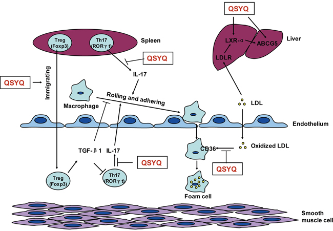 Figure 5: Proposed mechanism underlying QSYQ against atherosclerosis. During the development of atherosclerosis, macrophages roll and adhere on the injured endothelium and then infiltrate into sub-endothelium. Macrophages phagocytize oxidized LDL-C and turn into foam cell, which deposit in the sub-endothelium and form the lipid core of atherosclerotic plaque. Treg (Foxp3+) and Th17 (RORγt+) in spleen immigrate into plaque area. IL-17, the major pro-inflammatory cytokine secreted by Th17 in spleen and atherosclerotic plaque, promotes the rolling and adhering of macrophage, which can be inhibited by TGF-β1. In addition, blood LDL is combined by LDLR of hepatocyte and excreted into bile by LXR-α and ABCG5. The mechanism of QSYQ inhibiting atherosclerosis include promoting Treg immigration into atherosclerotic plaque, inhibiting the secretion of IL17 by Th17 in spleen and plaque, blocking oxidized LDL phagocytized by macrophage through CD36, and increasing the expression of LXR-α and ABCG5 in liver.