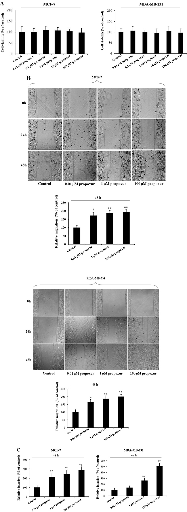 Figure 1: Propoxur treatment enhances the migration and invasion of human breast cancer cells. Both MCF-7 and MDA-MB-231 cells were cultured without or with 0.01, 1 or 100 μM propoxur, and then the effect of propoxur on cell viability was determined by (A) MTT assays. (B) Wound healing migration assay of propoxur-treated and untreated breast cancer cells (magnification, ×100). Distances migrated by propoxur-treated and untreated cells were compared in three independent experiments. (C) Invasiveness of breast cancer cells (treated with or without propoxur) was quantified by Transwell assays.