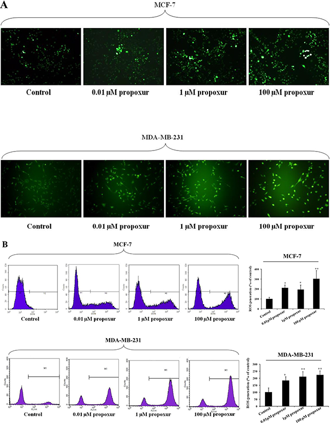 Figure 3: Propoxur treatment promotes intracellular ROS accumulation in human breast cancer cells. Both MCF-7 and MDA-MB-231 cells were cultured without or with 0.01, 1 or 100 μM propoxur. Intracellular ROS was significantly increased by propoxur treatment. (A) Intracellular ROS was visualized under the confocal microscope with 100× magnification. (B) The mean fluorescence intensity of MCF-7 cells (with or without propoxur treatment) was quantified by flow cytometry.