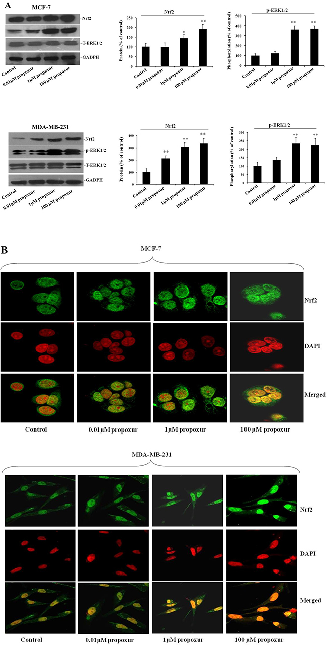 Figure 4: Propoxur augments Nrf2 expression and nuclear translocation and activates ERK1/2 activity. Both MCF-7 and MDA-MB-231 cells were cultured without or with 0.01, 1 or 100 μM propoxur. (A) Representative blot and electrophoretogram of Nrf2, T-ERK1/2, and p-ERK1/2 proteins, respectively. (B) Representative confocal images of Nrf2 after different dosing of propoxur treatment (magnification, ×400). Following fixation, the cells were stained with a Nrf2 antibody (green) and DAPI (red).