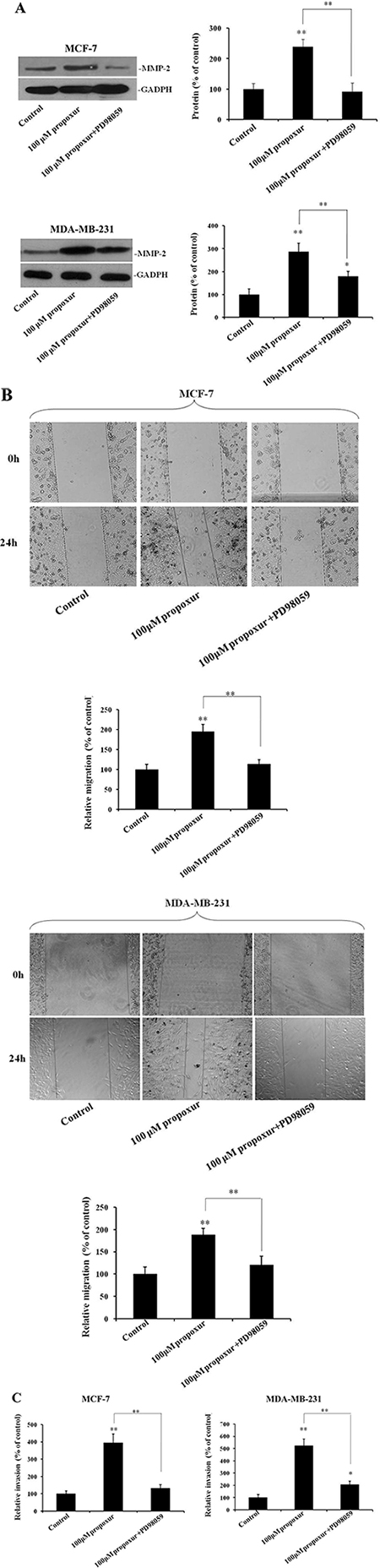Figure 6: Inhibiting ERK1/2 activation by PD98059 prevents propoxur-induced MMP-2 overexpression, and cell migration and invasion. Both MCF-7 and MDA-MB-231 cells were cultured without or with 100 μM propoxur, or 100 μM propoxur + 100 μM PD98059. (A) Representative blot and electrophoretogram of MMP-2 protein. (B) Wound healing migration assay of propoxur-treated and propoxur+PD98059 treated cells (magnification, ×100). Distances migrated by treated cells were compared in three independent experiments. (C) Invasiveness of cells was quantified by Transwell assays.