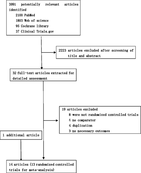 We identified 4035 studies for review of title and abstract (Figure 1). After initial screening, 32 potentially eligible articles for full text were retrieved. Eight articles from the same research centre and the same author at different follow up, the early four reports were removed [6, 10, 16, 17]. Fourteen trials were included for systematic review. One article was excluded for network meta-analysis due to insufficient data [18]. As a result, 13 studies [7, 9, 11, 12, 19–27] including 4098 patients and nine regimens were involved in this network meta-analysis (Figure 2).