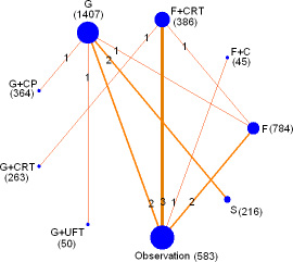 Pair wise meta-analysis did not suggest inconsistency in direct comparison (data not shown). The node-splitting models in our network meta-analysis included F, F+CRT; F, G, F, observation and G, observation. The node-splitting models suggested that there was no statistical difference between direct and indirect comparisons (P > 0.05) (Table 2).