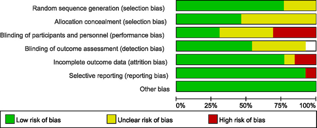 The quality of selected articles was independently assessed by two reviewers in accordance with the Cochrane Risk of Bias Tool including random sequence generation, allocation concealment of treatment, blinding, incomplete outcome data, selective outcome reporting and other sources of bias.