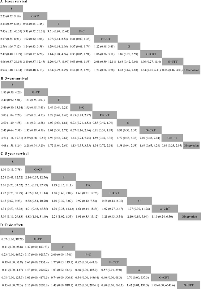 Figure 4: Pooled hazard ratios for survival and pooled odds ratios for overall toxic effects. (A) 1-year survival; (B) 3-year survival; (C) 5-year survival; (D) Overall grade 3–4 toxic effects. The column treatment is compared with the row treatment. Numbers in parentheses indicate hazard rations and 95% credible intervals.