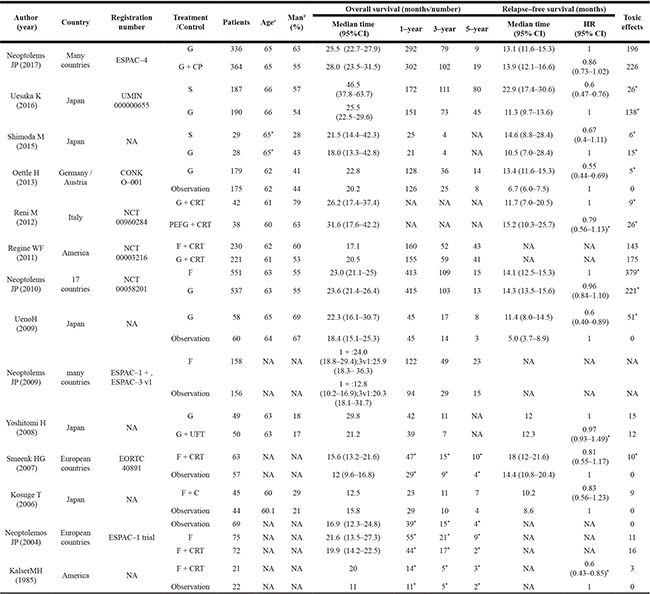 Inclusion criteria for this study were as follows: (i) all patients were histologically proven pancreatic ductal adenocarcinoma with macroscopically curative resection; (ii) trials were RCTs and patients received adjuvant chemotherapy or chemotherapy plus CRT; (iii) reports mentioned at least one of the outcomes of 1-year, 3-year and 5-year survival rates.