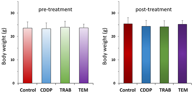 Figure 2: Body weights after CDDP, TRAB and TEM treatment. Bar graph shows body weight in each group at pre-treatment and 2 weeks after drug administration.