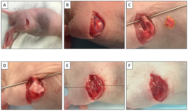 Figure 4: Establishment of the osteosarcoma PDOX model. (A) A skin incision was made on the right thigh. (B) The vastas lateralis muscle and biceps femoris muscle were split to reach the distal femur. (C) The lateral condyle of the distal femur was resected. (D) A single 3 mm tumor fragment was implanted orthotopically into the space. (E) The muscle was closed with a 6-0 nylon suture. (F) The tumor fragment was totally covered by the muscle.