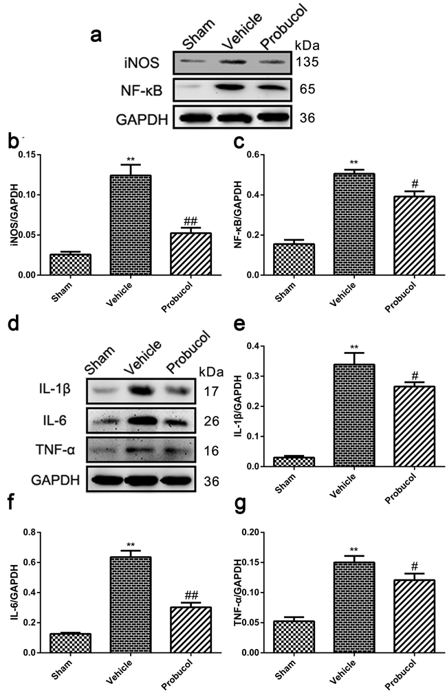 Figure 4: Probucol reduced the inflammation after SCI in rat. a. b. c. Representative western blots and quantification data of iNOS, NF-κB and GAPDH in each group rats on the seventh postoperative day; columns represent mean ± SD, **P < 0.01 versus the sham group, n = 5; #P < 0.05 versus the vehicle group, ##P < 0.01 versus the vehicle group, n = 5. d. e. f. g. Representative western blots and quantification data of IL-1β, IL-6, TNF-α and GAPDH in each group rats on the seventh postoperative day; columns represent mean ± SD, **P < 0.01 versus the sham group, n = 5; #P < 0.05 versus the vehicle group, n = 5.
