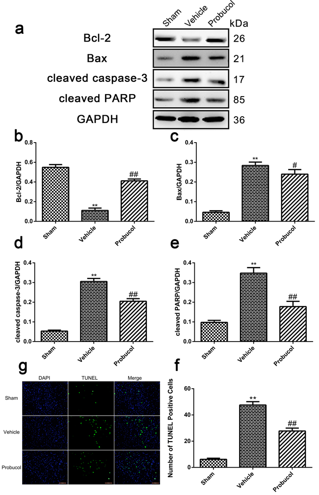 Expression levels of cleaved caspase-3, cleaved PARP, Bax, and Bcl-2 were analyzed by Western blotting. Probucol significantly inhibited the expression of cleaved caspase-3 and cleaved PARP caused by SCI (Figure 5a, 5d and 5e). Similarly, the level of anti-apoptotic protein Bcl-2 was upregulated, while the pro-apoptotic protein Bax was downregulated after treatment with probucol (Figure 5a-5c). The ability of probucol to inhibit cellular apoptosis after SCI was evaluated by TUNEL staining (Figure 5f). A greater number of TUNEL-positive cells was detected in the vehicle group than in the sham group, while there were significantly fewer apoptotic cells in the probucol group (Figure 5g). These results demonstrated that probucol administration inhibits apoptosis effectively after acute SCI.