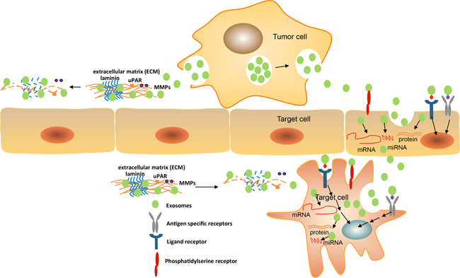 A notable feature of exosomal proteins is the maintenance of functional activities including antigen presentation, peptide, and protein cleavage [54]. Valadi et al. indicated that exosomes contain mRNAs and miRNAs, that transfer to recipient cells with the corresponding function for intercellular regulation [55]. Exosomal mRNAs can be translated and miRNAs can mediate RNA-silencing in target cells. Gene transfer and gene silence mediated by exosomes are specific to target cells that are found in one specific but not in another type of cell [55–57]. In addition, the relative abundance of proteins, mRNAs and miRNAs differs between exosomes and donor cells [58]. This implies active sorting into MVBs. For proteins, this can be achieved by mono-ubiquitination, localized in cholesterol-rich membrane micro-domains, or oligomerization of a higher order [47, 59]. Thus, exosomes constitute a most potent mode of intercellular communication that has become important for immunity, cell to cell spread of infectious agents and tumor progression [49, 54, 60, 61].